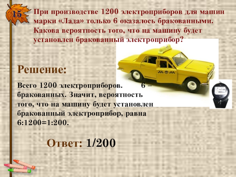 15.При производстве 1200 электроприборов для машин марки «Лада» только 6 оказалось бракованными. Какова вероятность того, что на