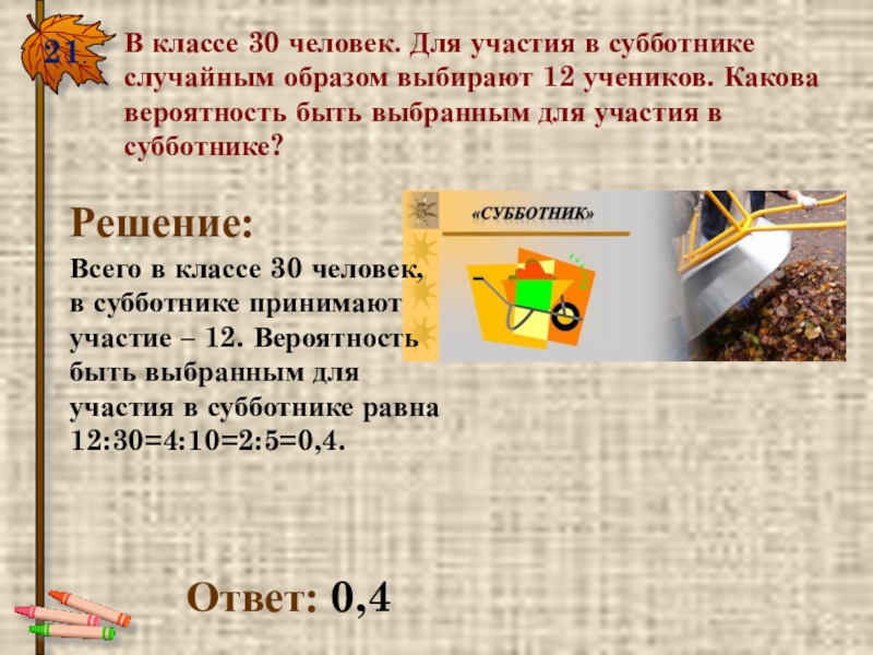 Всего в классе 30 человек, в субботнике принимают участие – 12. Вероятность быть выбранным для участия в субботнике равна 12:30=4:10=2:5=0,4.