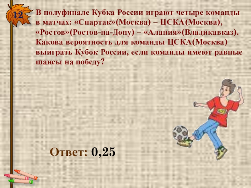 12.В полуфинале Кубка России играют четыре команды в матчах: «Спартак»(Москва) – ЦСКА(Москва), «Ростов»(Ростов-на-Дону) – «Алания»(Владикавказ). Какова вероятность