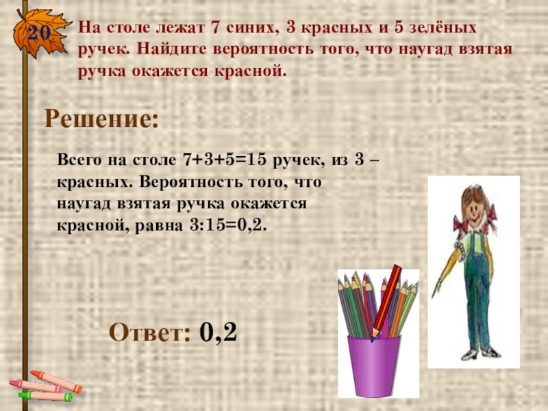 20.На столе лежат 7 синих, 3 красных и 5 зелёных ручек. Найдите вероятность того, что наугад взятая