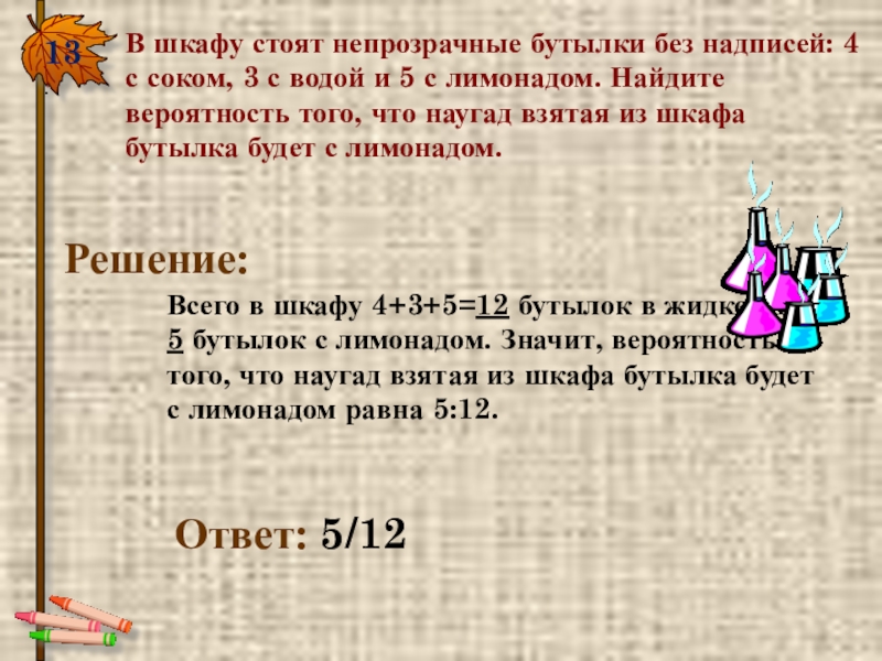 13.В шкафу стоят непрозрачные бутылки без надписей: 4 с соком, 3 с водой и 5 с лимонадом.
