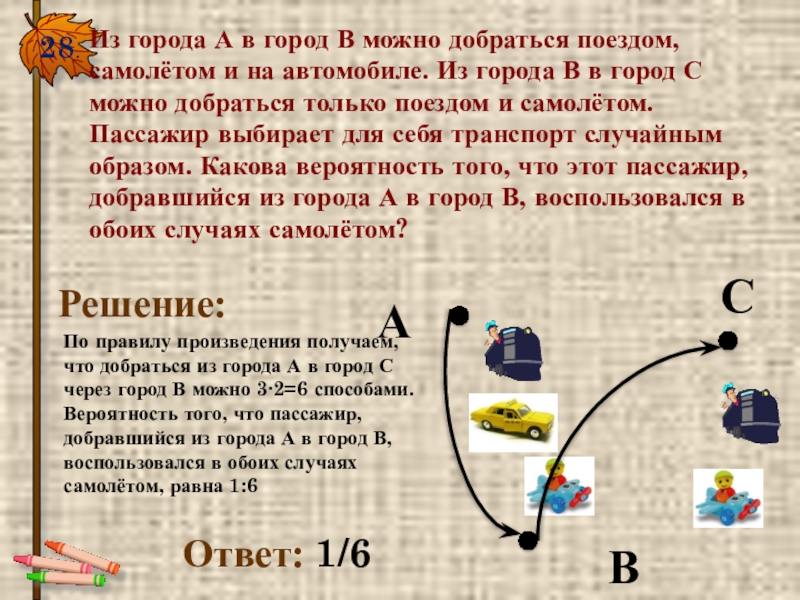 28.Из города А в город В можно добраться поездом, самолётом и на автомобиле. Из города В в