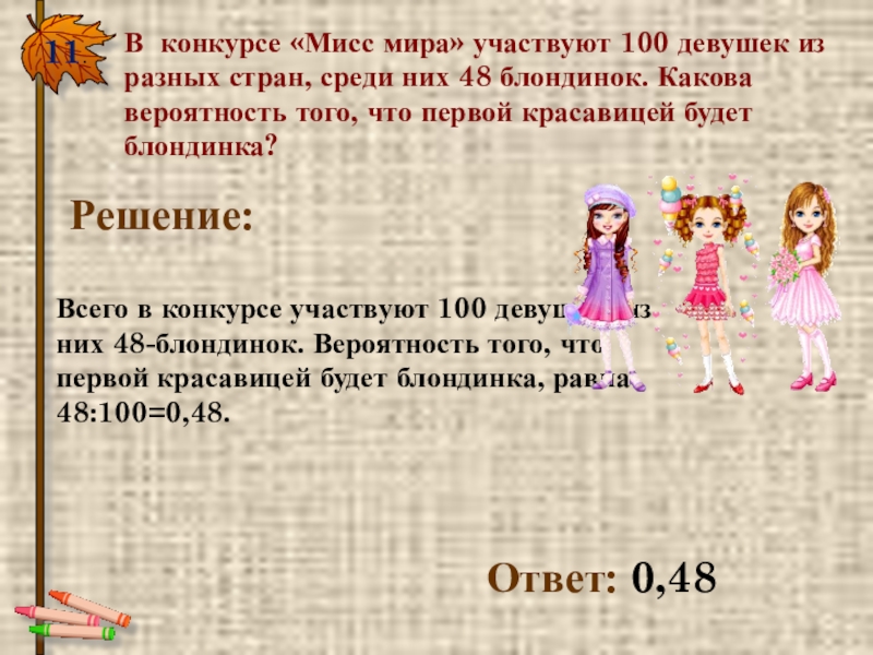 11.В конкурсе «Мисс мира» участвуют 100 девушек из разных стран, среди них 48 блондинок. Какова вероятность того,