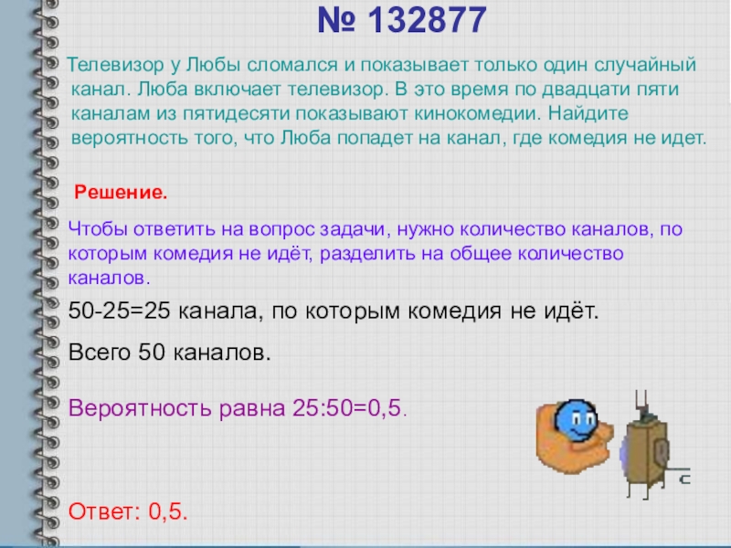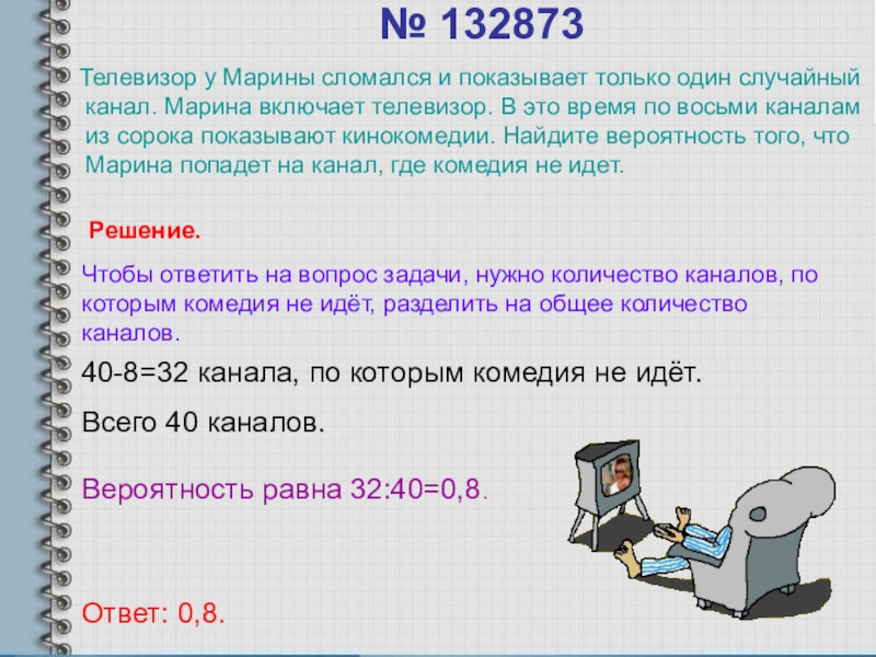 Чтобы ответить на вопрос задачи, нужно количество каналов, по которым комедия не идёт, разделить на общее количество каналов.