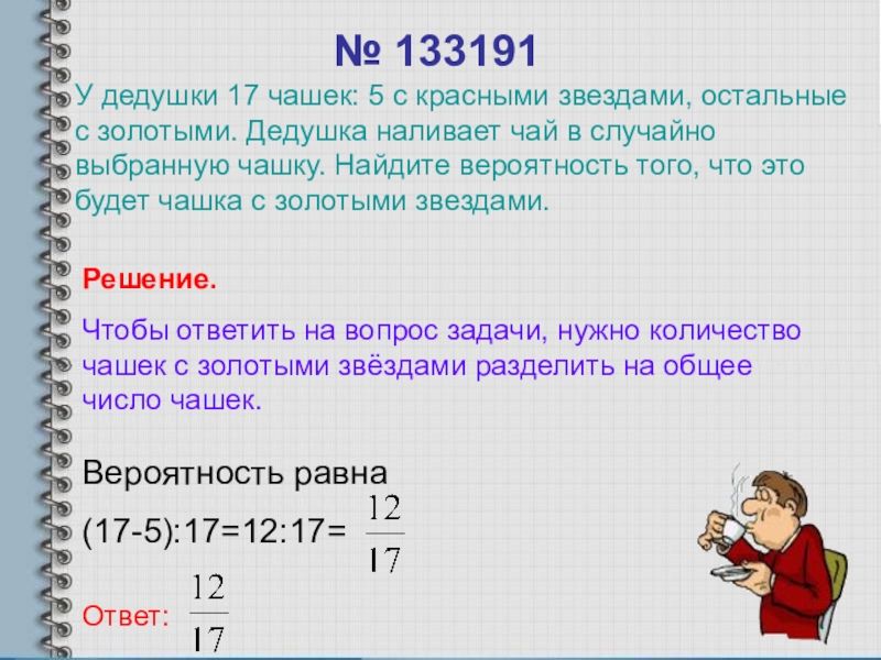 У дедушки 17 чашек: 5 с красными звездами, остальные с золотыми. Дедушка наливает чай в случайно выбранную чашку. Найдите вероятность того, что это будет чашка с золотыми звездами.