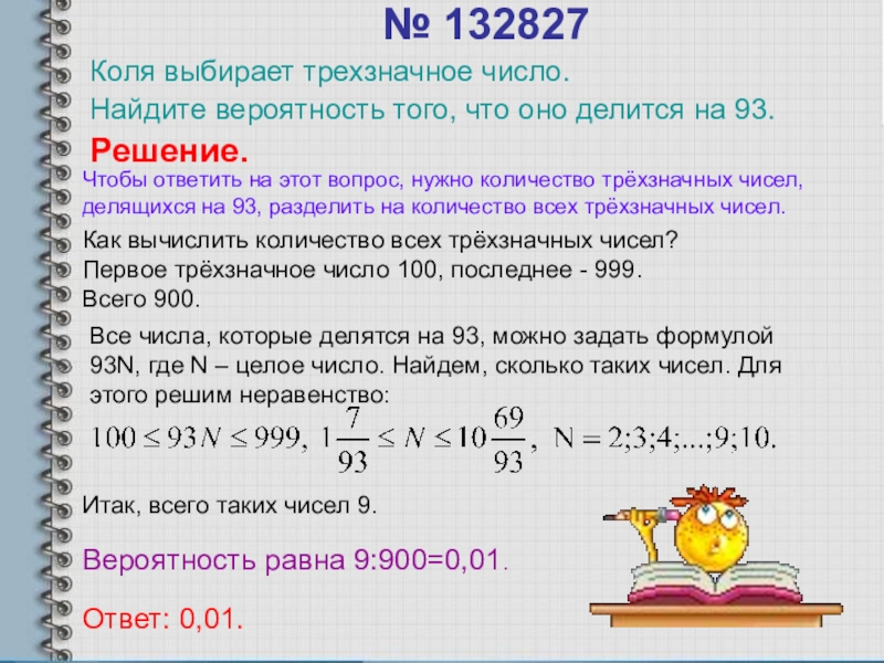 Все числа, которые делятся на 93, можно задать формулой 93N, где N – целое число. Найдем, сколько таких чисел. Для этого решим неравенство: