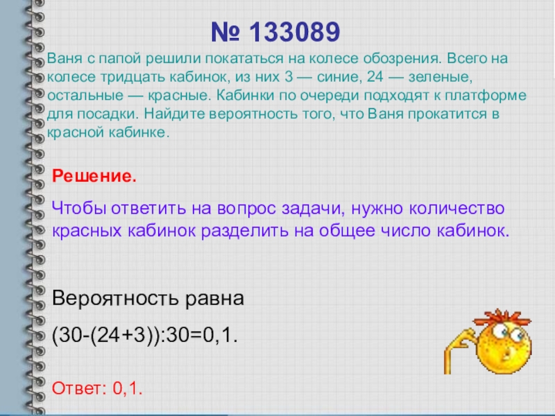 Ваня с папой решили покататься на колесе обозрения. Всего на колесе тридцать кабинок, из них 3 — синие, 24 — зеленые, остальные — красные. Кабинки по очереди подходят к платформе для посадки. Найдите вероятность того, что Ваня прокатится в красной кабинке.