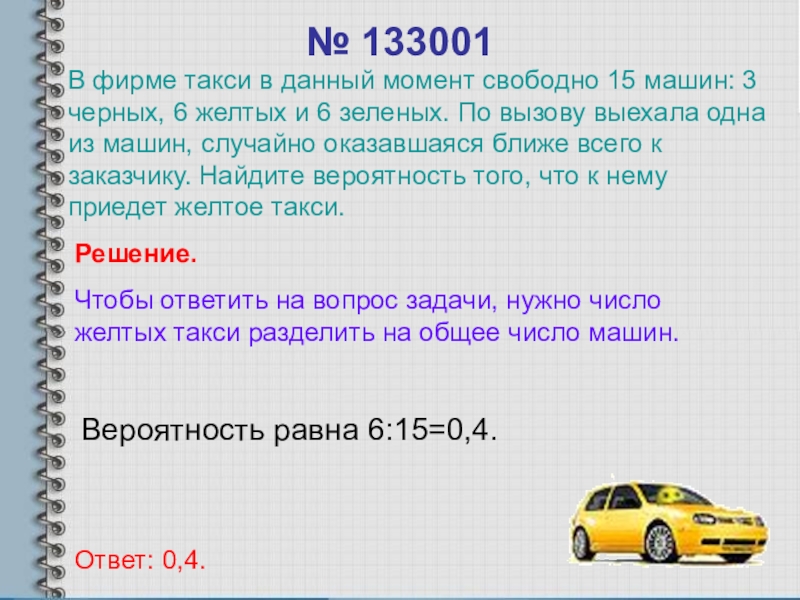 В фирме такси в данный момент свободно 15 машин: 3 черных, 6 желтых и 6 зеленых. По вызову выехала одна из машин, случайно оказавшаяся ближе всего к заказчику. Найдите вероятность того, что к нему приедет желтое такси.