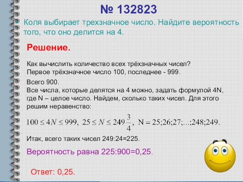Все числа, которые делятся на 4 можно, задать формулой 4N, где N – целое число. Найдем, сколько таких чисел. Для этого решим неравенство: