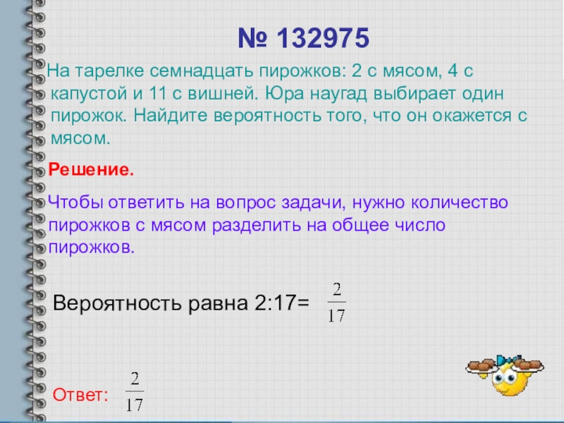 Чтобы ответить на вопрос задачи, нужно количество пирожков с мясом разделить на общее число пирожков.