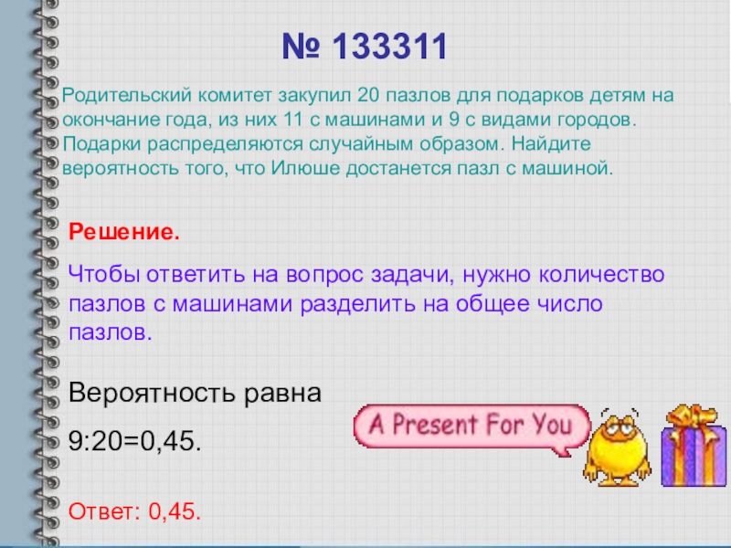 Родительский комитет закупил 20 пазлов для подарков детям на окончание года, из них 11 с машинами и 9 с видами городов. Подарки распределяются случайным образом. Найдите вероятность того, что Илюше достанется пазл с машиной.