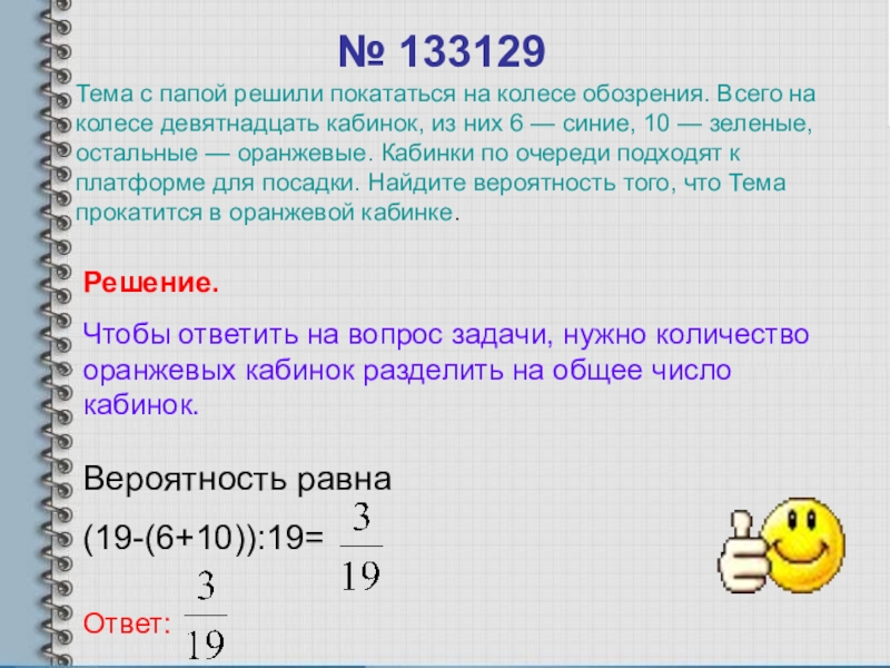 Тема с папой решили покататься на колесе обозрения. Всего на колесе девятнадцать кабинок, из них 6 — синие, 10 — зеленые, остальные — оранжевые. Кабинки по очереди подходят к платформе для посадки. Найдите вероятность того, что Тема прокатится в оранжевой кабинке.