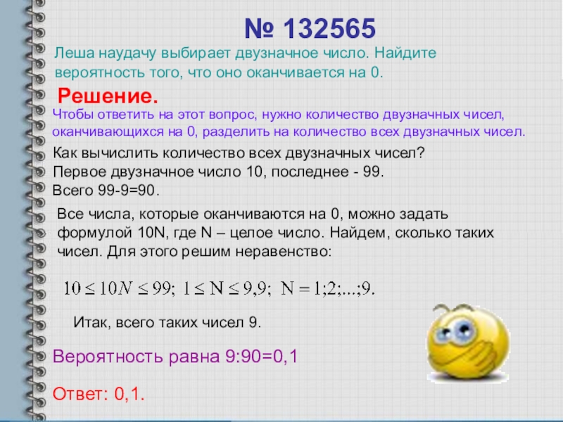 Все числа, которые оканчиваются на 0, можно задать формулой 10N, где N – целое число. Найдем, сколько таких чисел. Для этого решим неравенство: