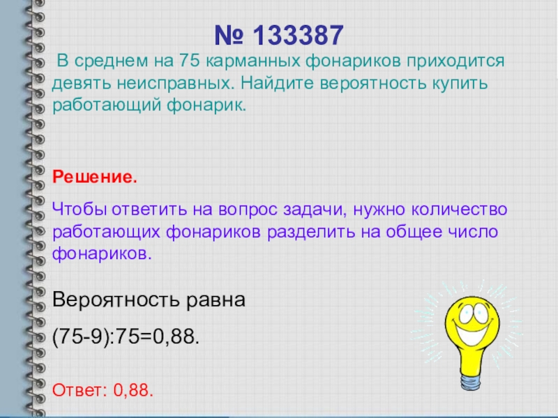 В среднем на 75 карманных фонариков приходится девять неисправных. Найдите вероятность купить работающий фонарик.