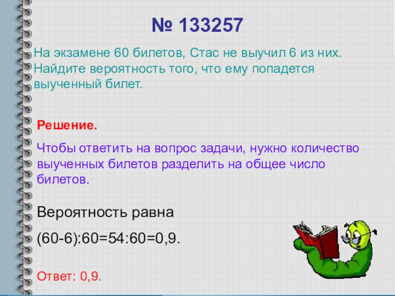 На экзамене 60 билетов, Стас не выучил 6 из них. Найдите вероятность того, что ему попадется выученный билет.