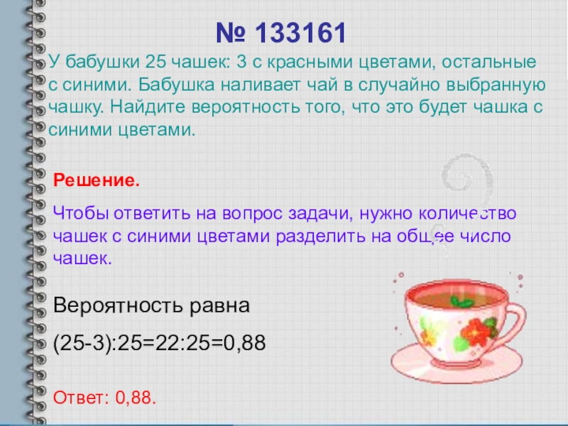 У бабушки 25 чашек: 3 с красными цветами, остальные с синими. Бабушка наливает чай в случайно выбранную чашку. Найдите вероятность того, что это будет чашка с синими цветами.