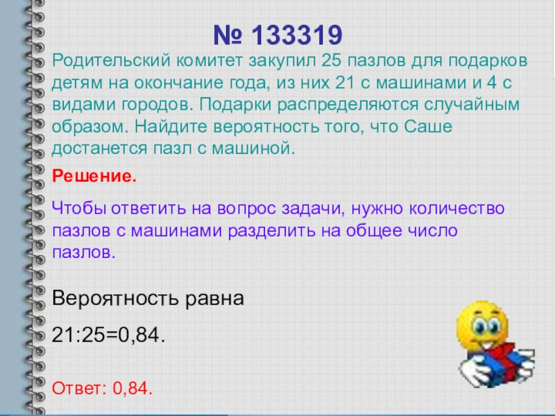 Родительский комитет закупил 25 пазлов для подарков детям на окончание года, из них 21 с машинами и 4 с видами городов. Подарки распределяются случайным образом. Найдите вероятность того, что Саше достанется пазл с машиной.