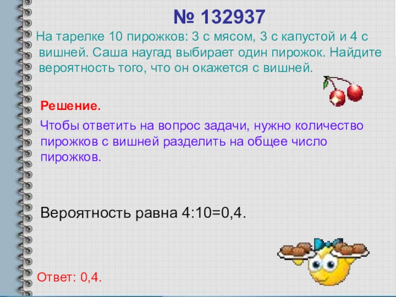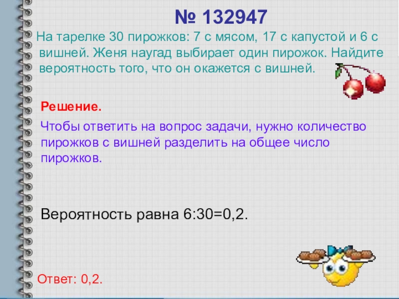 Чтобы ответить на вопрос задачи, нужно количество пирожков с вишней разделить на общее число пирожков.