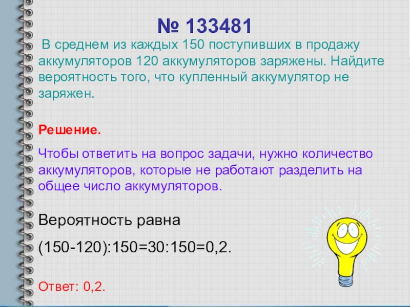 В среднем из каждых 150 поступивших в продажу аккумуляторов 120 аккумуляторов заряжены. Найдите вероятность того, что купленный аккумулятор не заряжен.