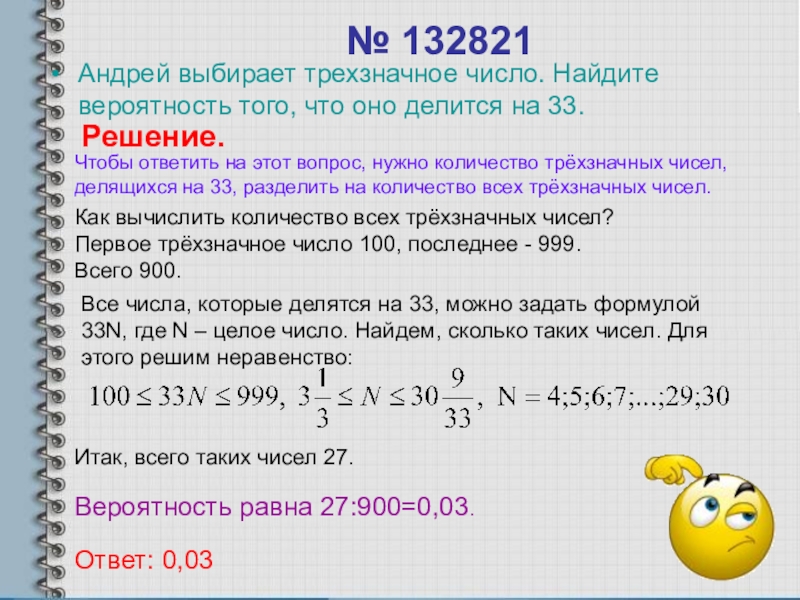 Чтобы ответить на этот вопрос, нужно количество трёхзначных чисел, делящихся на 33, разделить на количество всех трёхзначных чисел.