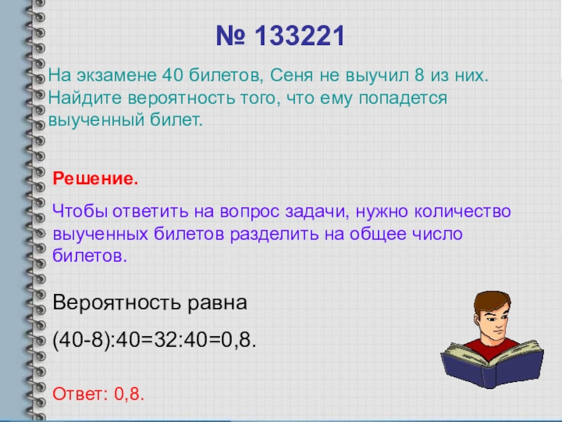 На экзамене 40 билетов, Сеня не выучил 8 из них. Найдите вероятность того, что ему попадется выученный билет.
