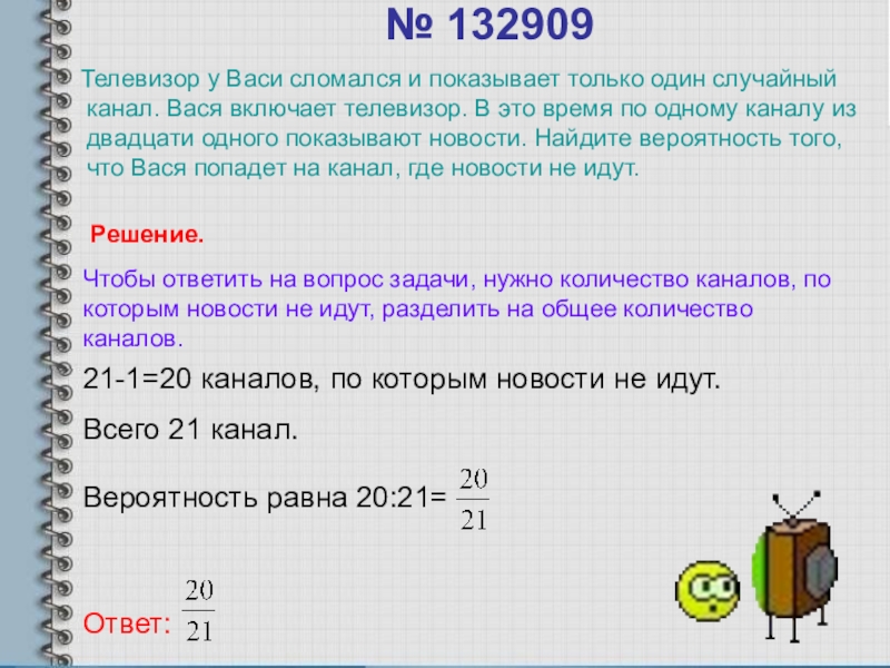 Чтобы ответить на вопрос задачи, нужно количество каналов, по которым новости не идут, разделить на общее количество каналов.