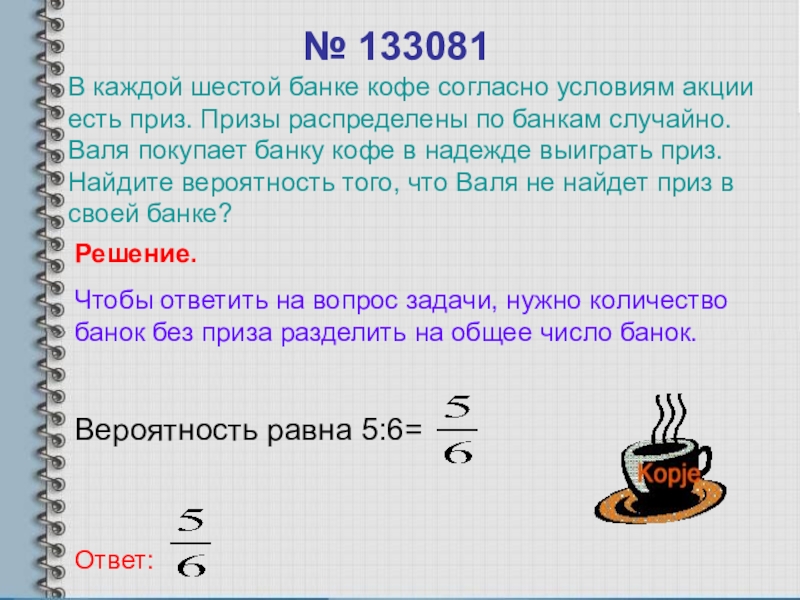 В каждой шестой банке кофе согласно условиям акции есть приз. Призы распределены по банкам случайно. Валя покупает банку кофе в надежде выиграть приз. Найдите вероятность того, что Валя не найдет приз в своей банке?