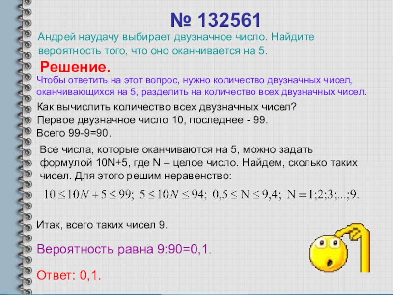 Все числа, которые оканчиваются на 5, можно задать формулой 10N+5, где N – целое число. Найдем, сколько таких чисел. Для этого решим неравенство: