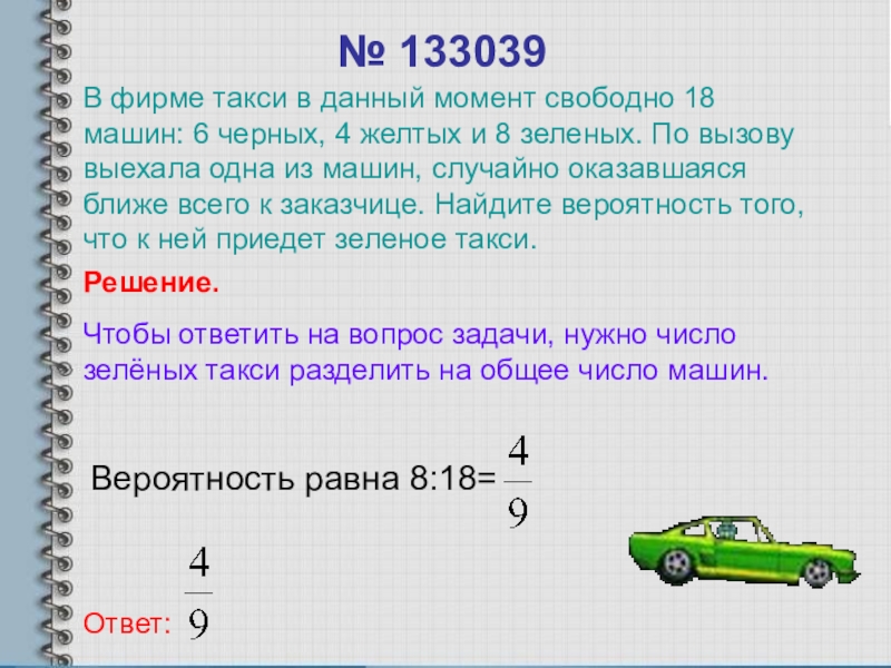 В фирме такси в данный момент свободно 18 машин: 6 черных, 4 желтых и 8 зеленых. По вызову выехала одна из машин, случайно оказавшаяся ближе всего к заказчице. Найдите вероятность того, что к ней приедет зеленое такси.