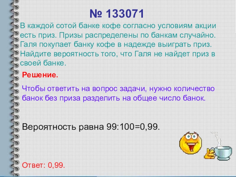 В каждой сотой банке кофе согласно условиям акции есть приз. Призы распределены по банкам случайно. Галя покупает банку кофе в надежде выиграть приз. Найдите вероятность того, что Галя не найдет приз в своей банке.