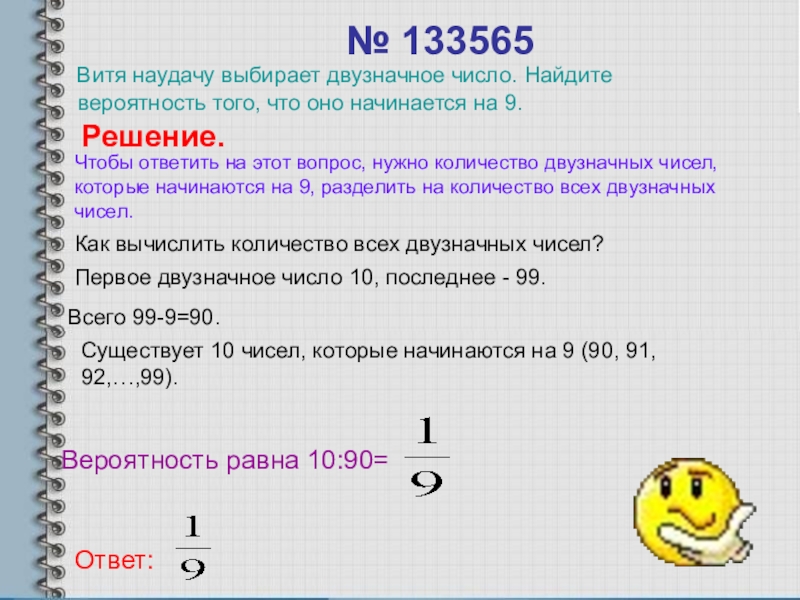 Чтобы ответить на этот вопрос, нужно количество двузначных чисел, которые начинаются на 9, разделить на количество всех двузначных чисел.