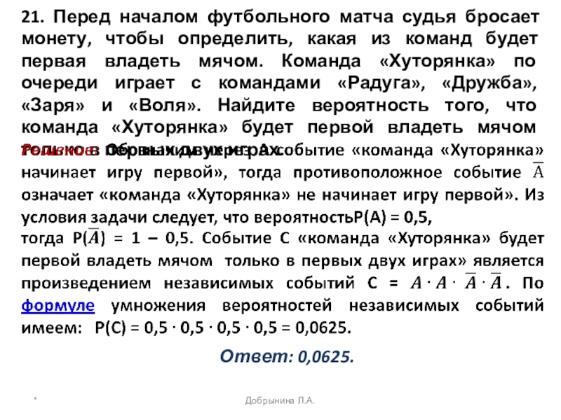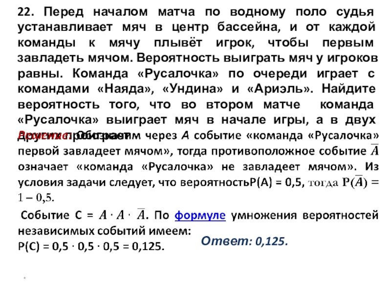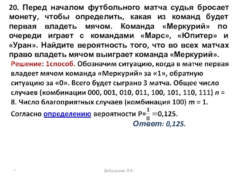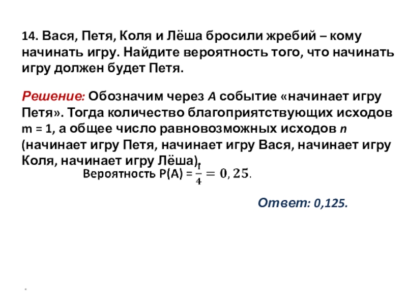 Решение: Обозначим через A событие «начинает игру Петя». Тогда количество благоприятствующих исходов m = 1, а общее число равновозможных исходов n (начинает игру Петя, начинает игру Вася, начинает игру Коля, начинает игру Лёша).