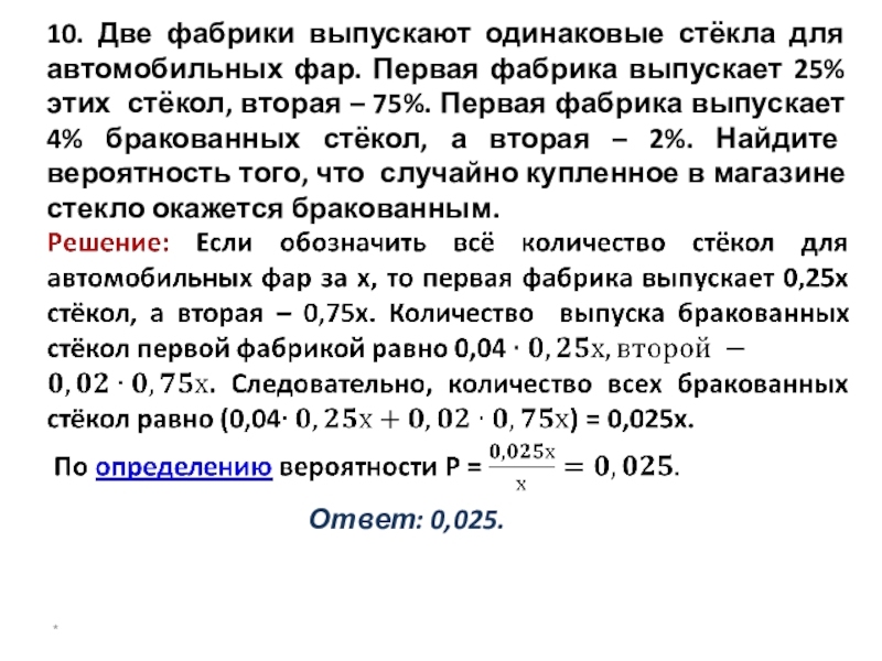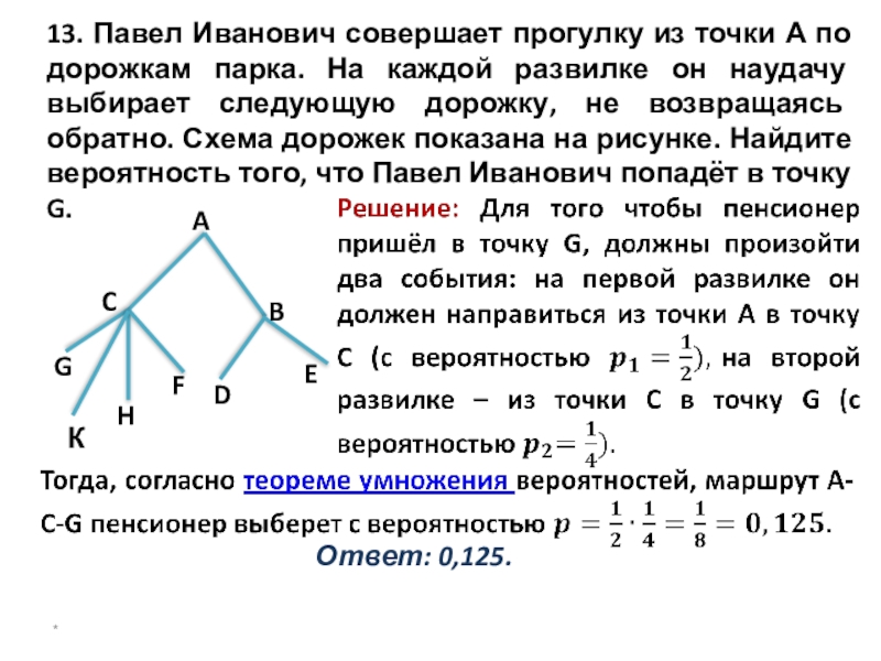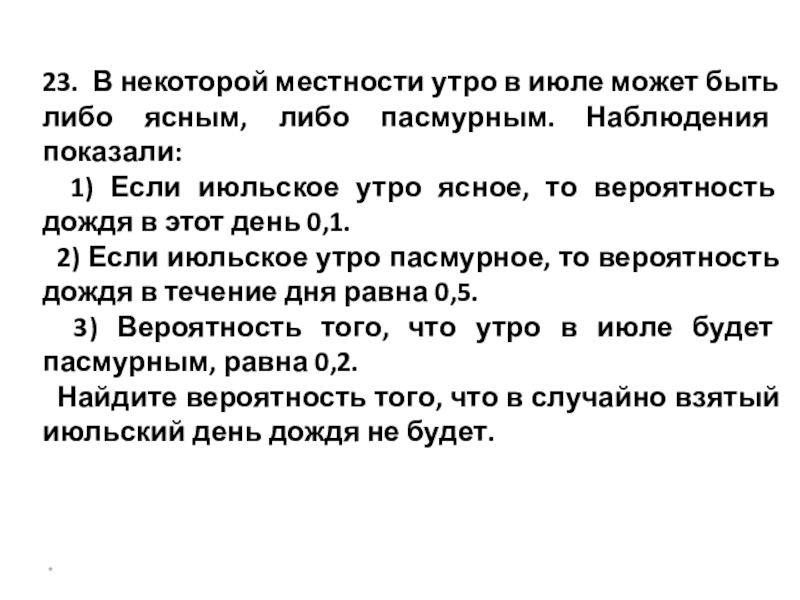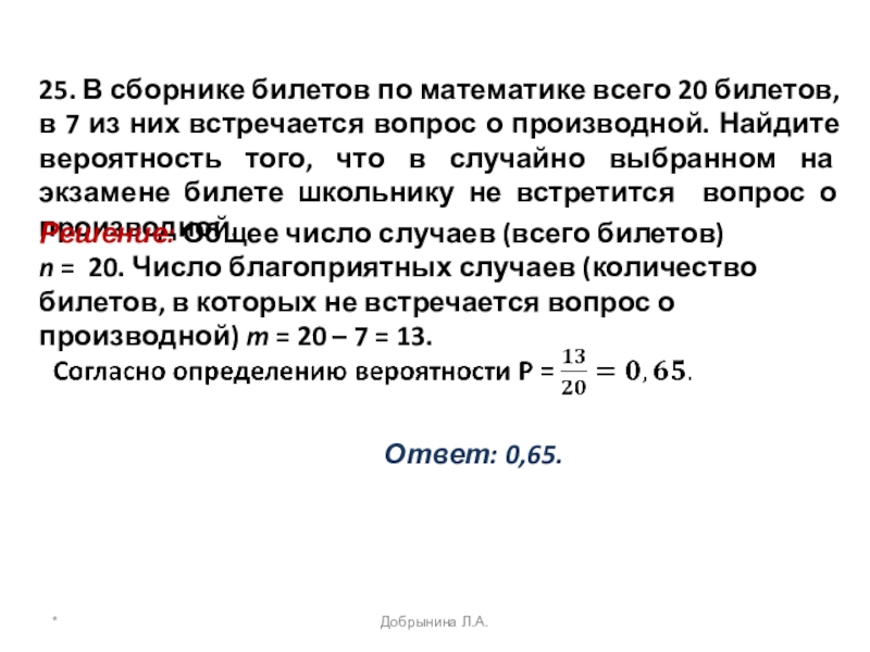 n = 20. Число благоприятных случаев (количество билетов, в которых не встречается вопрос о производной) m = 20 – 7 = 13.