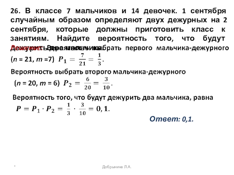 Решение: В каждой группе 7 человек. Будем считать, что Митя уже занял место в одной группе. Обозначим через А событие «Петя оказался в той же группе». Для Пети останется n = 20 свободных мест, из них m = 6 мест.