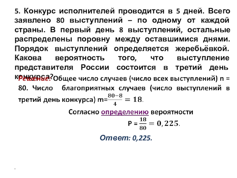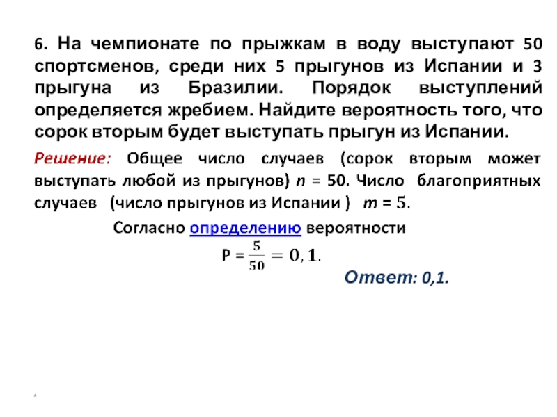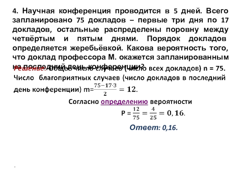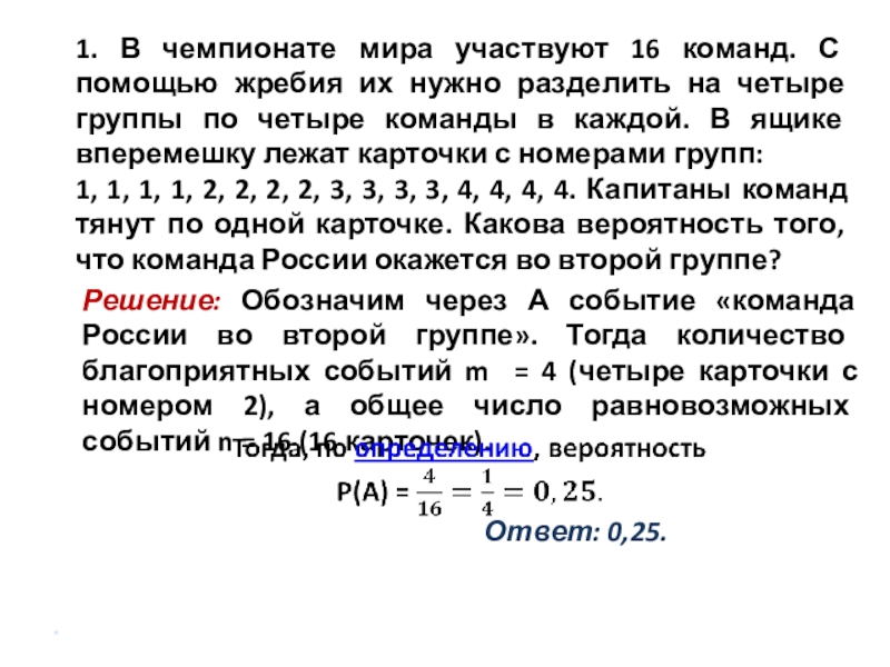 Решение: Обозначим через А событие «команда России во второй группе». Тогда количество благоприятных событий m = 4 (четыре карточки с номером 2), а общее число равновозможных событий n = 16 (16 карточек).