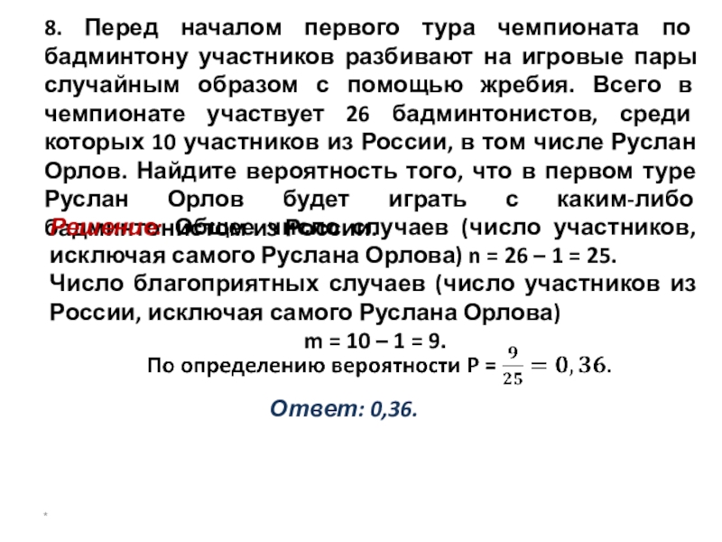 Решение: Общее число случаев (число участников, исключая самого Руслана Орлова) n = 26 – 1 = 25.