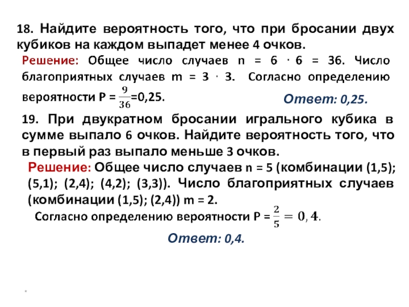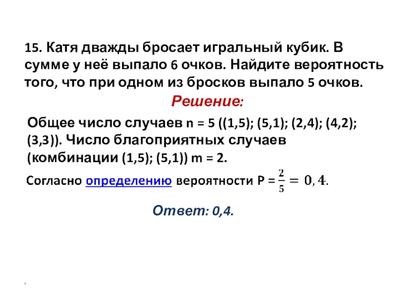 Решение: Общее число случаев n = 5 (комбинации (1,5); (5,1); (2,4); (4,2); (3,3)). Число благоприятных случаев (комбинации (1,5); (2,4)) m = 2.