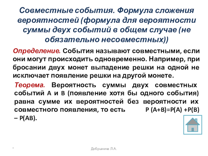 Определение. События называют совместными, если они могут происходить одновременно. Например, при бросании двух монет выпадение решки на одной не исключает появление решки на другой монете.