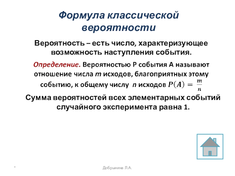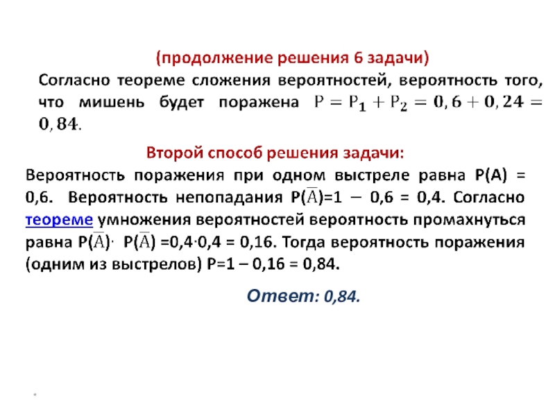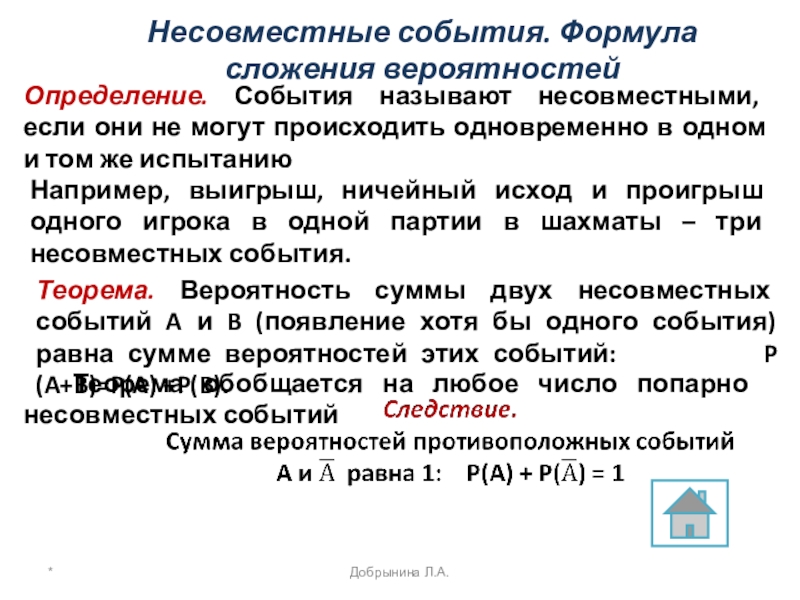 Теорема. Вероятность суммы двух несовместных событий A и B (появление хотя бы одного события) равна сумме вероятностей этих событий: P (A+B)=P(A) +P(B).