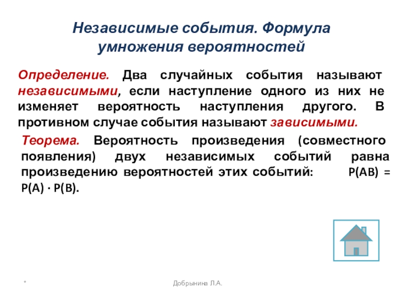 Теорема. Вероятность произведения (совместного появления) двух независимых событий равна произведению вероятностей этих событий: P(AB) = P(A) · P(B).