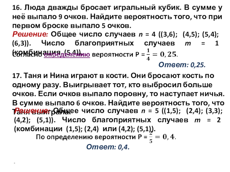 17. Таня и Нина играют в кости. Они бросают кость по одному разу. Выигрывает тот, кто выбросил больше очков. Если очков выпало поровну, то наступает ничья. В сумме выпало 6 очков. Найдите вероятность того, что Таня выиграла.