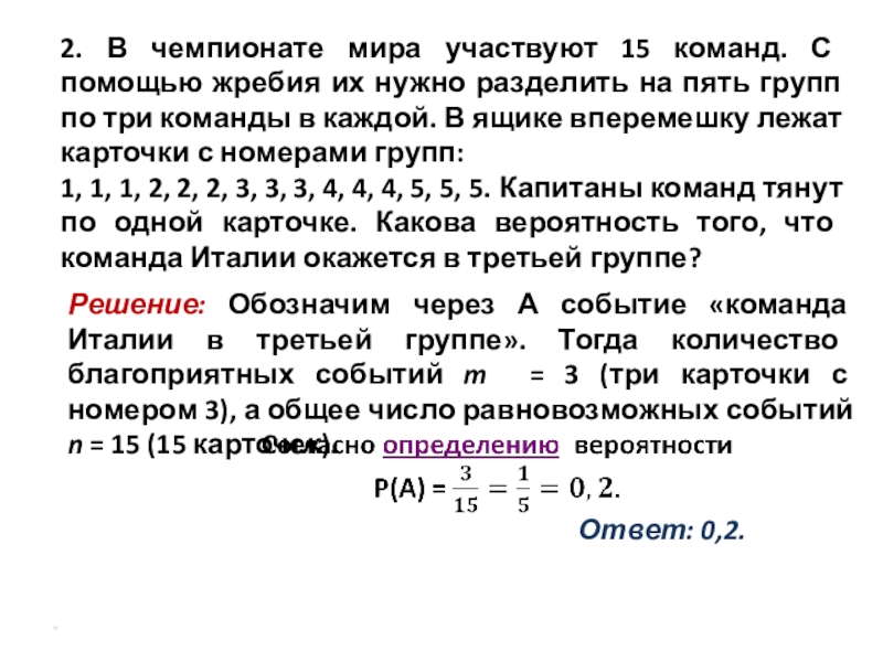 Решение: Обозначим через А событие «команда Италии в третьей группе». Тогда количество благоприятных событий m = 3 (три карточки с номером 3), а общее число равновозможных событий n = 15 (15 карточек).