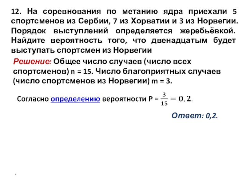 Решение: Общее число случаев (число всех спортсменов) n = 15. Число благоприятных случаев (число спортсменов из Норвегии) m = 3.