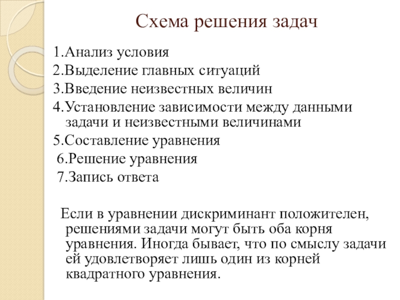 Если в уравнении дискриминант положителен, решениями задачи могут быть оба корня уравнения. Иногда бывает, что по смыслу задачи ей удовлетворяет лишь один из корней квадратного уравнения.
