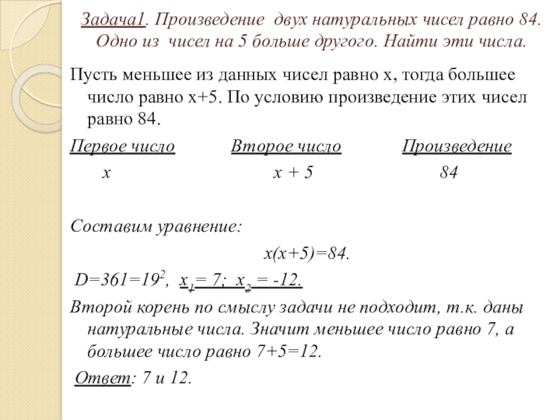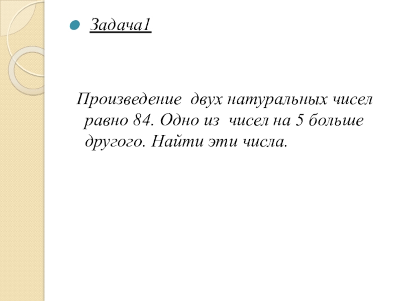 Слайд 8Задача1. Произведение двух натуральных чисел равно 84. Одно из чисел на