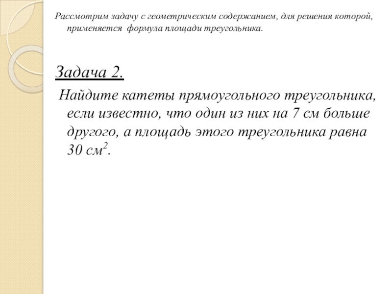 Слайд 9Рассмотрим задачу с геометрическим содержанием, для решения которой, применяется формула площади