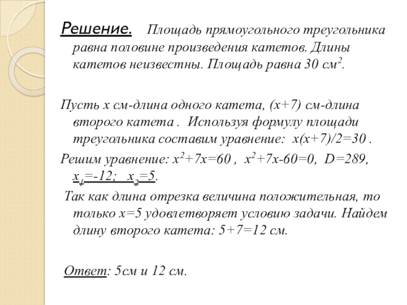 Найдите катеты прямоугольного треугольника, если известно, что один из них на 7 см больше другого, а площадь этого треугольника равна 30 см2.