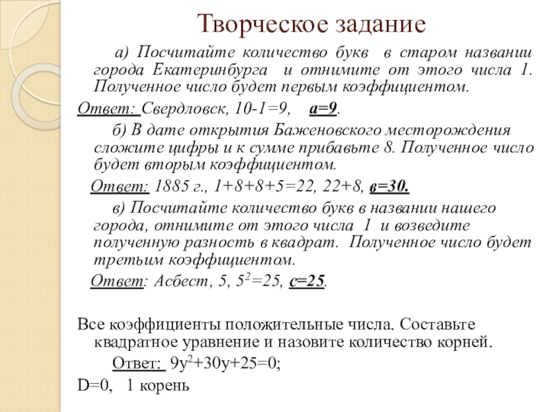 в) Посчитайте количество букв в названии нашего города, отнимите от этого числа 1 и возведите полученную разность в квадрат. Полученное число будет третьим коэффициентом.