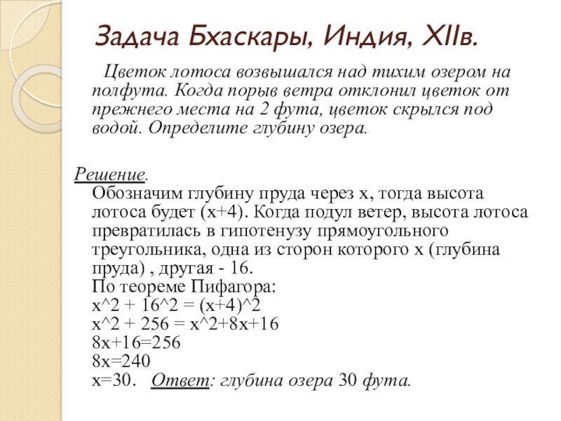 озером на полфута. Когда порыв ветра отклонил цветок от прежнего места на 2 фута, цветок скрылся под водой. Определите глубину озера.