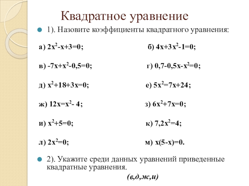 2). Укажите среди данных уравнений приведенные квадратные уравнения.